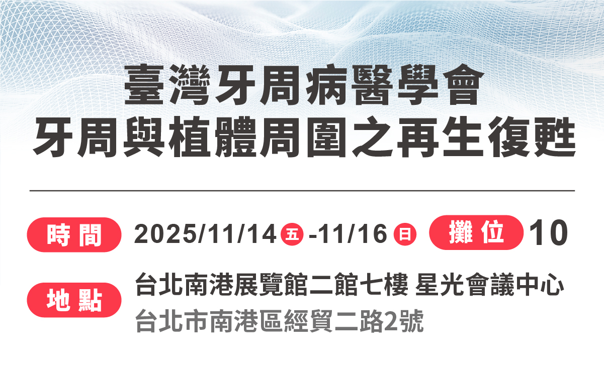 台湾牙周病医学会年会 时间:2025/11/14 (五)-11/16(日) 地点:台北南港展览馆二馆七楼 星光会议中心 (台北市南港区经贸二路2号) 摊位:10
