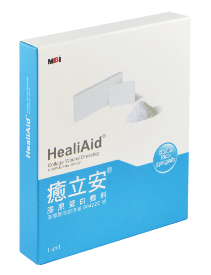 MBI和康生技的膠原蛋白再生基材醫療器材,適用於淺表創傷,有深度的傷口(深度<0.3cm),一級與二級燒傷,皮膚潰瘍,使用於外科手術的止血,當結紮止血或傳統的止血方法無效或無法控制時,作為止血的輔助品。